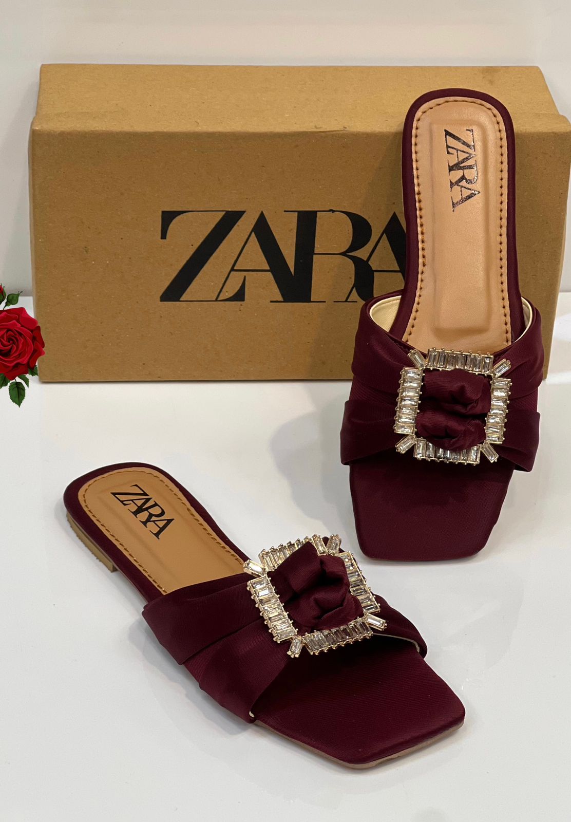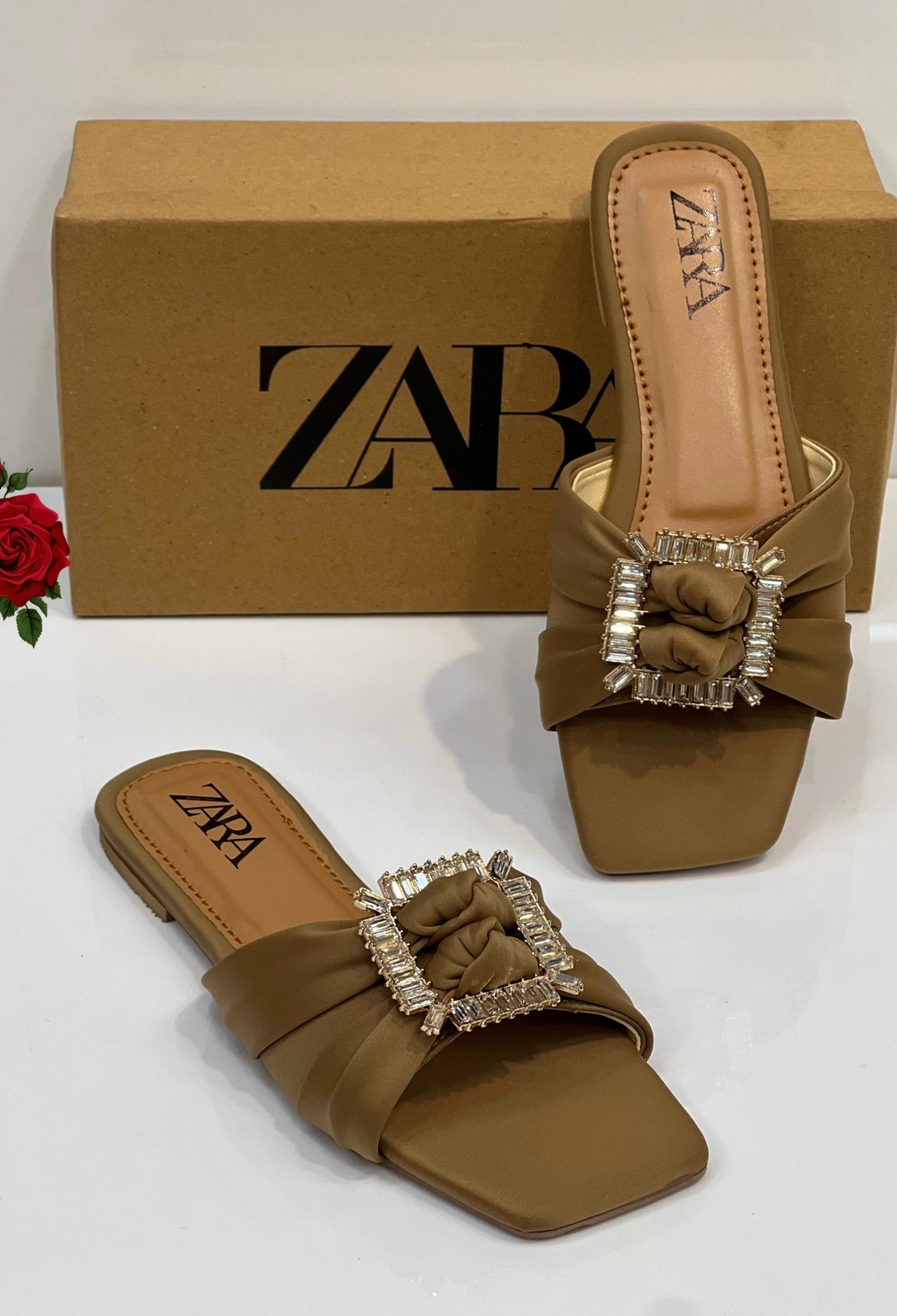 Step into effortless sophistication with these chic slipper. Crafted in a rich camel-brown tone, they feature a soft, pleated upper finished with a statement rhinestone buckle for a touch of refined glamour. The square toe design and cushioned insole provide comfort without sacrificing style, making them perfect for both casual outings and dressier occasions.